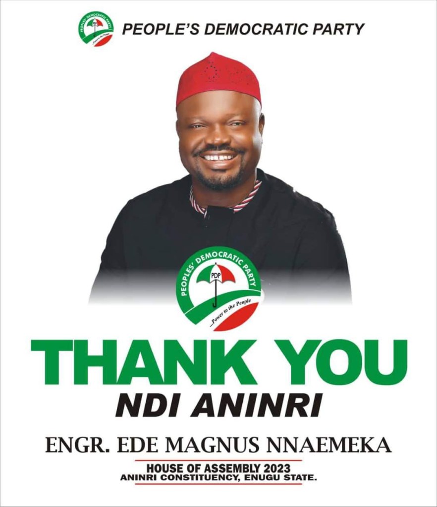 Hon. Ejike Okeke – Aka Ekpuchi Onwa Aninri in a special way congratulate the Governor Elect Enugu State Barr.Dr. Peter Mbah and Engr. Magnus Ede for a well deserved victory at the Enugu State Governorship and State Assembly Elections held on 18th March, 2023. He prayed that the spirit of God will guide them as they implement their manifesto towards the development of Enugu State. He stated that he have high confidence in their capacity, pedigree and track records hence his involvement in their campaigns spiritually and Physically.